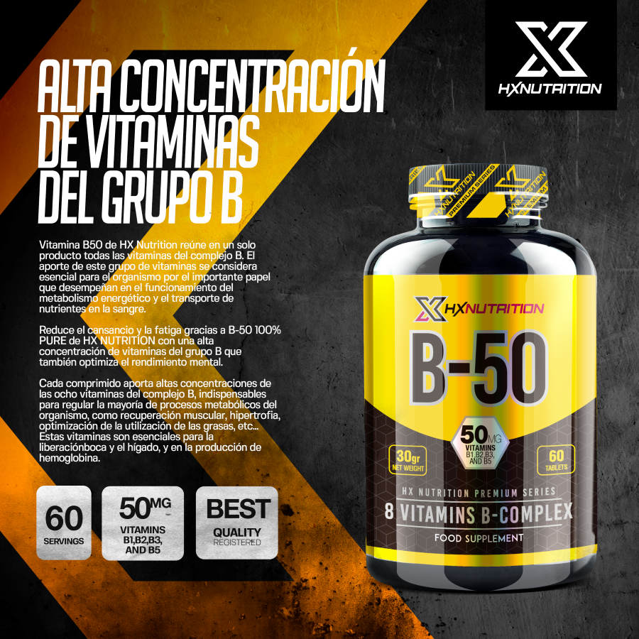 Vitamina B50 de HX Premium reúne todas las vitaminas del complejo B.