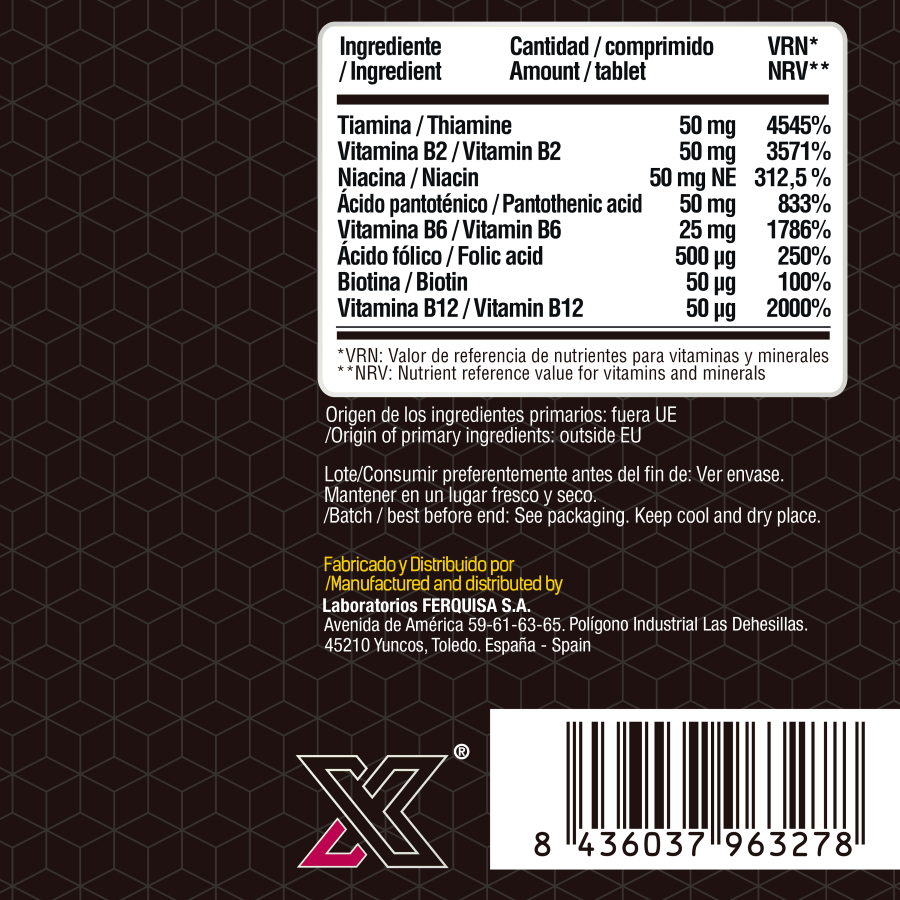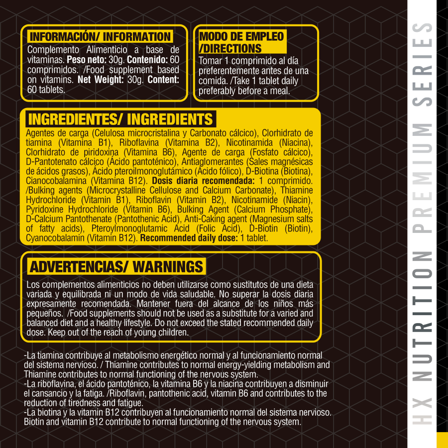 Cada comprimido aporta altas concentraciones de las 8 vitaminas del complejo B, indispensables para regular los procesos metabólicos del organismo: recuperación muscular, hipertrofia, optimización del uso de las grasas, transporte de nutrientes etc...